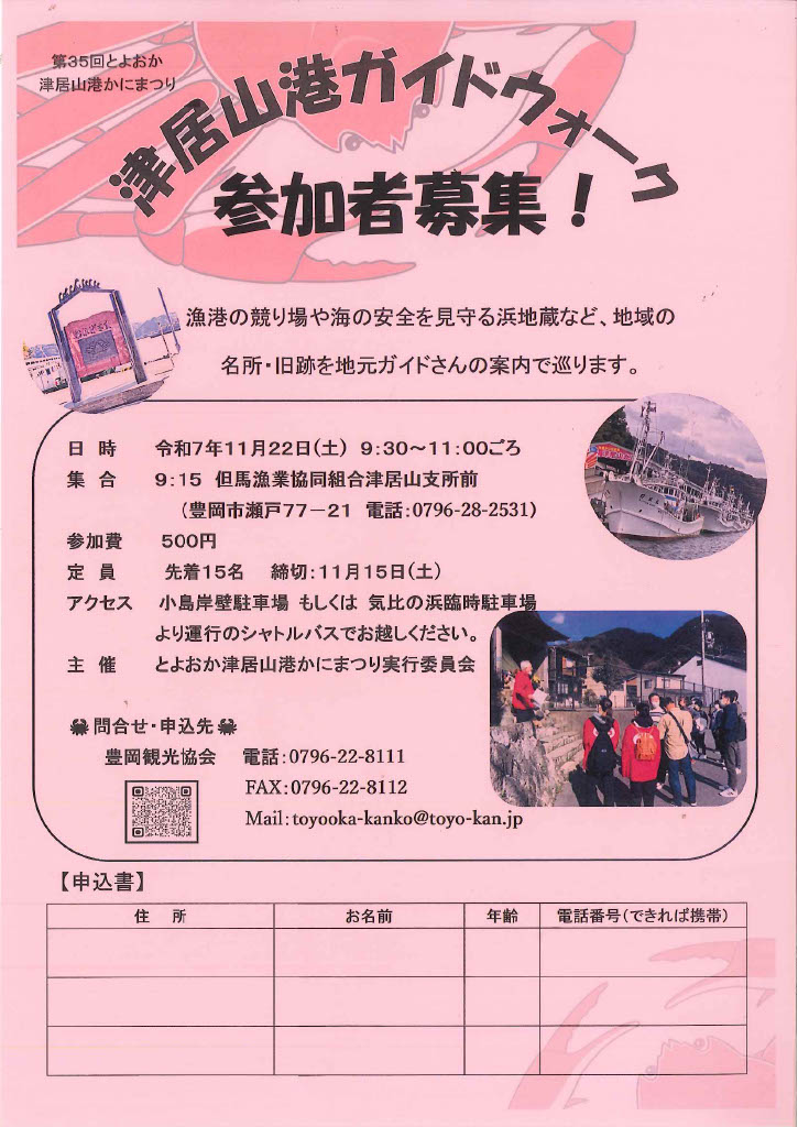 | 集 合 | 但馬漁業協同組合津居山支所前 9:15集合 (豊岡市瀬戸77-21 TEL:0796-28-2531) |