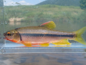 夏のオイカワとカワムツ、婚姻色が鮮やかです。
