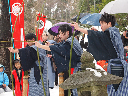 氏神の平内神社で、門脇、伊賀、矢引の武将にふんした3人の少年が、境内の御神木に源氏に見立て掲げた的めがけて、地区内で採取した竹で作った弓矢で101本の矢を射るもので、歩射という弓の神事から始められたといわれています。