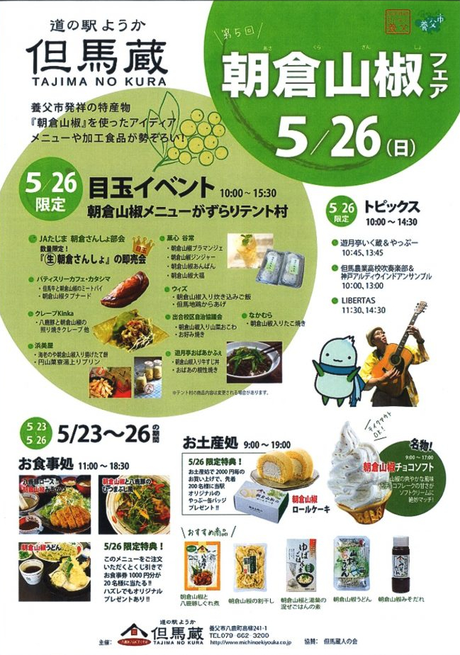 26日には数量限定「生 朝倉さんしょ」の販売や、朝倉山椒メニュー勢揃いのテント村と、ようか但馬蔵は山椒づくしですよ。