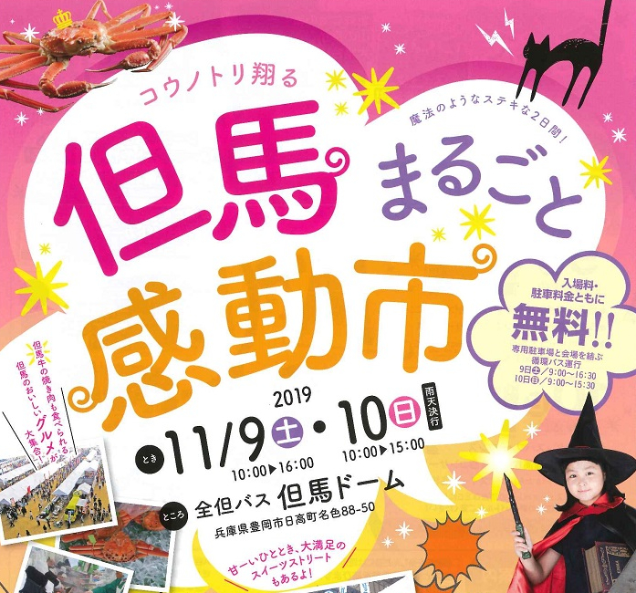 全但バス 但馬ドームで「コウノトリ翔る 但馬まるごと感動市」が開催されます。 ★但馬牛の焼き肉も食べられる但馬のおいしいグルメが大集合! ★甘ーいひととき、大満足のスイーツストリートもあるよ! ★家族みんなで楽しめる多彩なステージや楽しい体験教室!