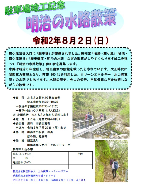 霧ケ滝渓谷入口に「駐車場」が整備されました。県指定「名勝・霧ケ滝」「秘境・霧ケ滝渓谷」「歴史遺産・明治の水路」などの散策がしやすくなります竣工を祝って「明治の水路散策」参加者を募集します。