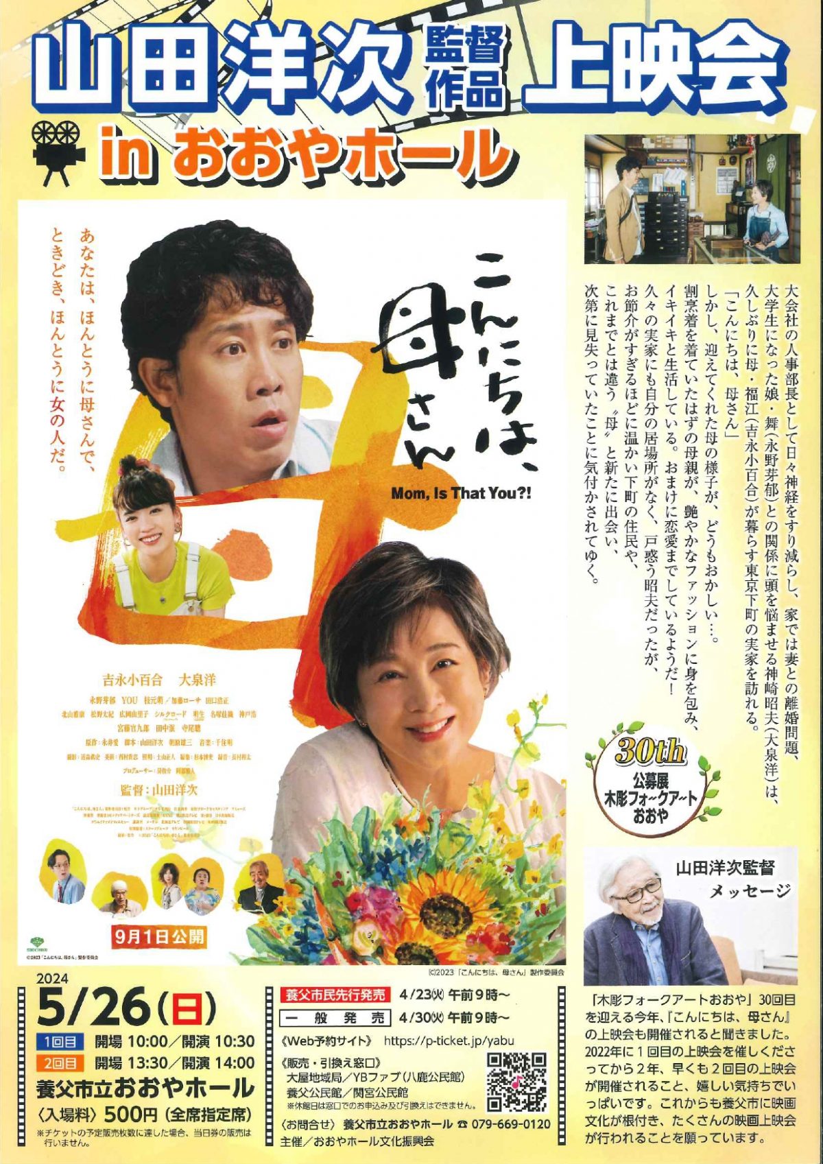山田洋次監督作品上映会inおおやホール「こんにちは、母さん」 このイベント・募集は終了しています 開催日 : 2024.05.26 ~ 2024.05.26 投稿日 : 2024.05.07 | 養父市| ふるさとづくり協会 でシェア でシェア でシェア でシェア 「公募展木彫フォークアートおおや」の審査員を務めた山田洋次映画監督の最新作『こんにちは、母さん』を上映します。 日時 2024年5月26日(日) 1回目:開場10:00/開演10:30 2回目:開場13:30/開演14:00 場所 養父市立おおやホール(養父市大屋町山路7番地) アクセス 入場料 500円(全席指定) ※チケットの予定販売枚数に達した場合、当日券の販売は行いません ◆チケット販売について◆ ・養父市民先行販売 4月23日(火) 9:00~ ・一般販売 4月30日(火) 9:00~ 《Web予約サイト》 予約サイトはこちらから 《販売・引換窓口》 大屋地域局/YBファブ(八鹿公民館)/養父公民館/関宮公民館 ※休館日は窓口でのお申込み及び引換えはできません。 リンク先 養父市HPイベント情報 連絡先 <お問合せ> 養父市立おおやホール TEL:079-669-0120