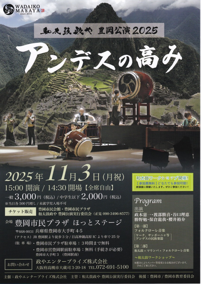 チケット | 一般3,000円/中学生以下2,000円 ※当日各500円増し ※未就学児入場不可 ◆チケット販売◆ 豊岡市民会館 豊岡市民プラザ 和太鼓政や 豊岡公演実行委員会(正見 090-3496-8577) |
