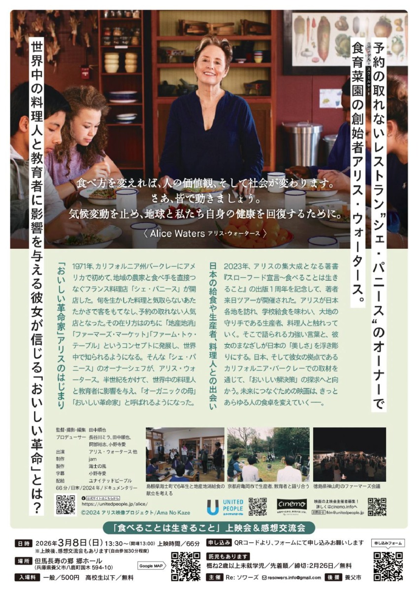 『食べることは生きること~アリス・ウォータースのおいしい革命~』上映会&感想交流会 開催日 : 2026.03.08 ~ 2026.03.08 投稿日 : 2026.01.22 | 養父市| 一般投稿 でシェア でシェア でシェア でシェア 掲載依頼日: 20260118 開催日(開始日): 2026/3/8 開催日(終了日): 2026/3/8 地域: 養父市 メールアドレス: amgg78@gmail.com 担当者: Re:ソワーズ 電話番号: 07044495116 日時 2026年3月8日(日) 13:30~(開場13:00) 場所 但馬長寿の郷 郷ホール(養父市八鹿町国木594-10)アクセス 入場料 一般500円/高校生以下無料 ◆◇申込方法◆◇ Web申込フォームからお申し込みください お申し込み締切:2月26日(木) 先着順