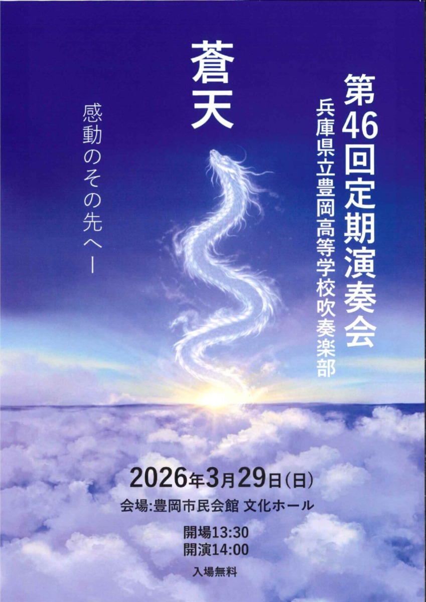 豊岡高等学校吹奏楽部第46回定期演奏会 蒼天 開催日 : 2026.03.29 ~ 2026.03.29 投稿日 : 2026.03.20 | 豊岡市| ふるさとづくり協会 でシェア でシェア でシェア でシェア 日時 2026年3月29日(日) 14:00(開場 13:30) 場所 豊岡市民会館 文化ホール(豊岡市立野町20-34)アクセス 入場料 無料