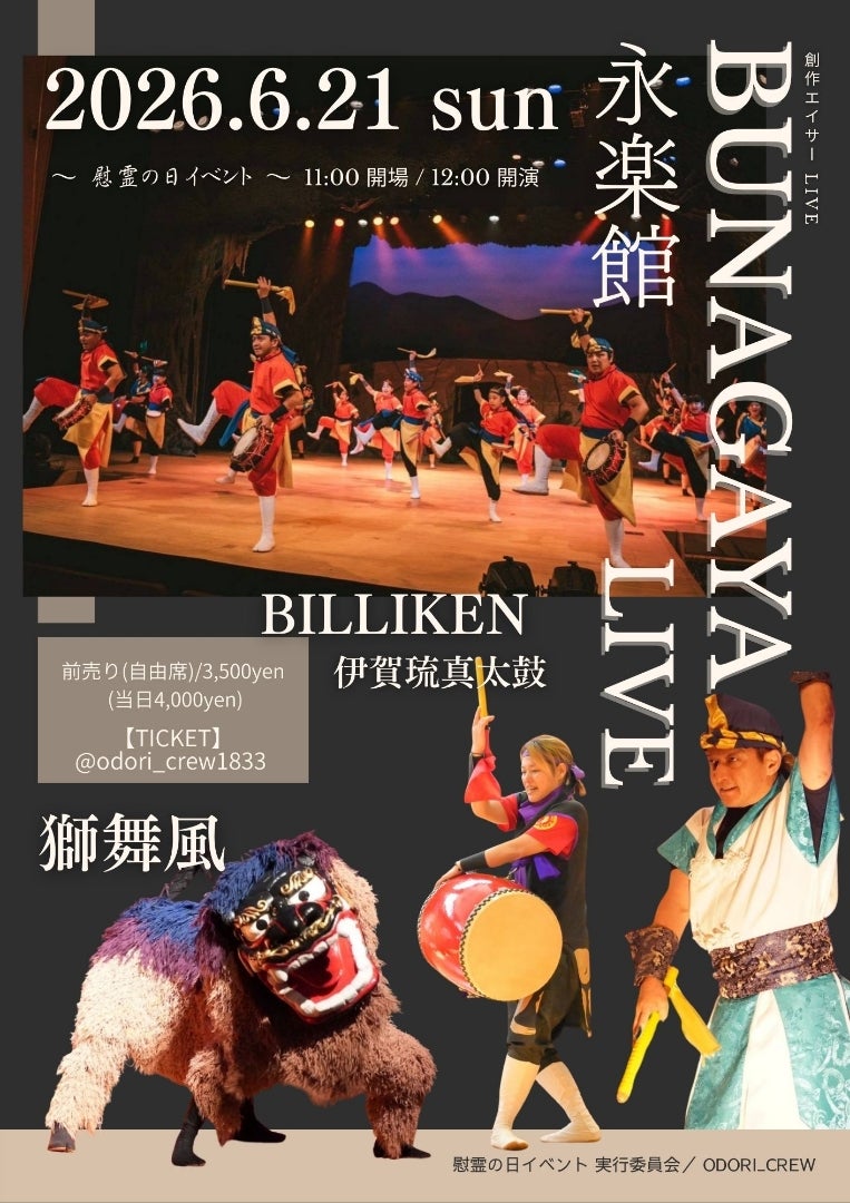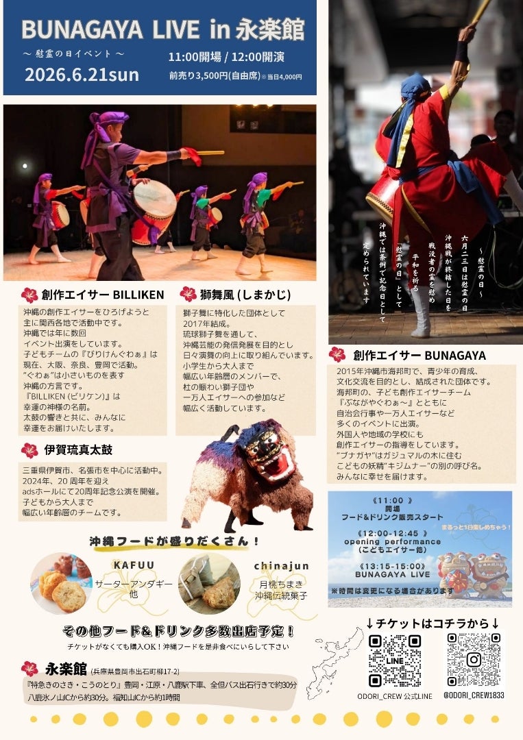 創作エイサーLIVE BUNAGAYA LIVE in 永楽館 開催日 : 2026.06.21 ~ 2026.06.21 開催時間 : 11:00 ~ 15:00 投稿日 : 2026.04.17 | 豊岡市| 一般投稿 でシェア でシェア でシェア でシェア 掲載依頼日: 2026/4/13 開催日(開始日): 2026/6/21 開催日(終了日): 2026/6/21 開催開始時間: 11:00 開催終了時間: 15:00 地域: 豊岡市 メールアドレス: tjm-furusato5@tajima.or.jp 担当者: 森岡 日 時 2026年6月21日(日) 12:00(11:00開場) 場 所 出石永楽館(豊岡市出石町柳17-2) アクセス 料 金 前売3,500円 ※当日4,000円 チケットはInstagram、または公式LINEから 12:00~12:45 Opening performance こどもエイサー ほか 13:15~15:00 BUNAGAYA LIVE ※時間は変更になる場合があります <キッチンカー・フード販売> ・サーターアンダギー ・沖縄伝統菓子&月桃ちまき その他フード&ドリンク多数出店予定! <沖縄風雑貨販売> ・SHOP1833
