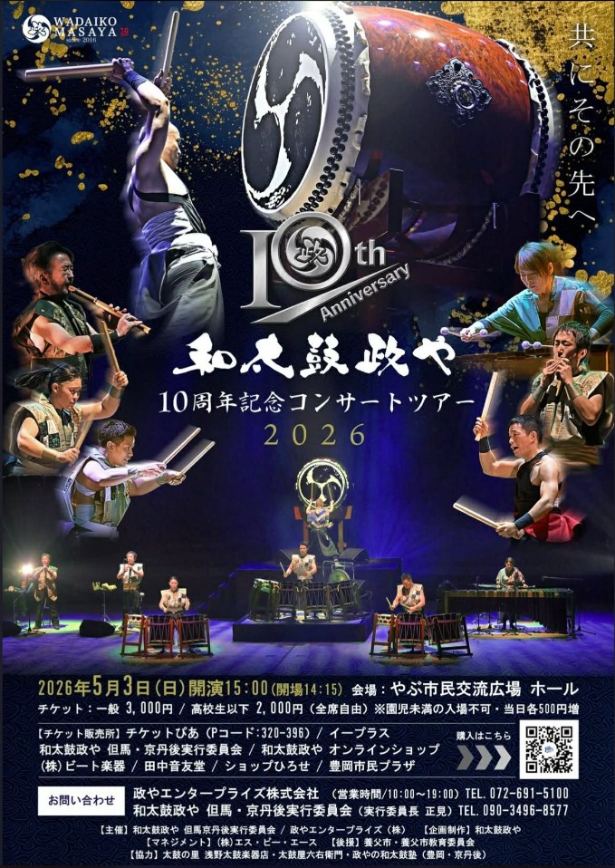 | チケット | 一般3,000円/中学生以下2,000円 ※当日各500円増し ※未就学児入場不可 ◆チケット販売 チケットぴあ(Pコード320-396)/イープラス/和太鼓政やオンラインショップ ビート楽器/田中音友堂/ショップひろせ/豊岡市民プラザ 和太鼓政や 但馬・京丹後実行委員会(正見 090-3496-8577) |