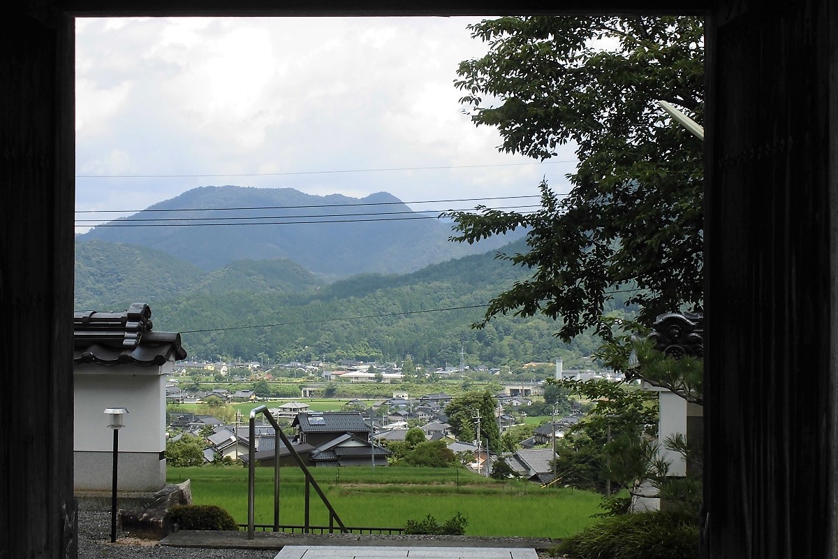 山門越しに粟鹿地区ののどかな田園風景が美しい、癒しの休息だ