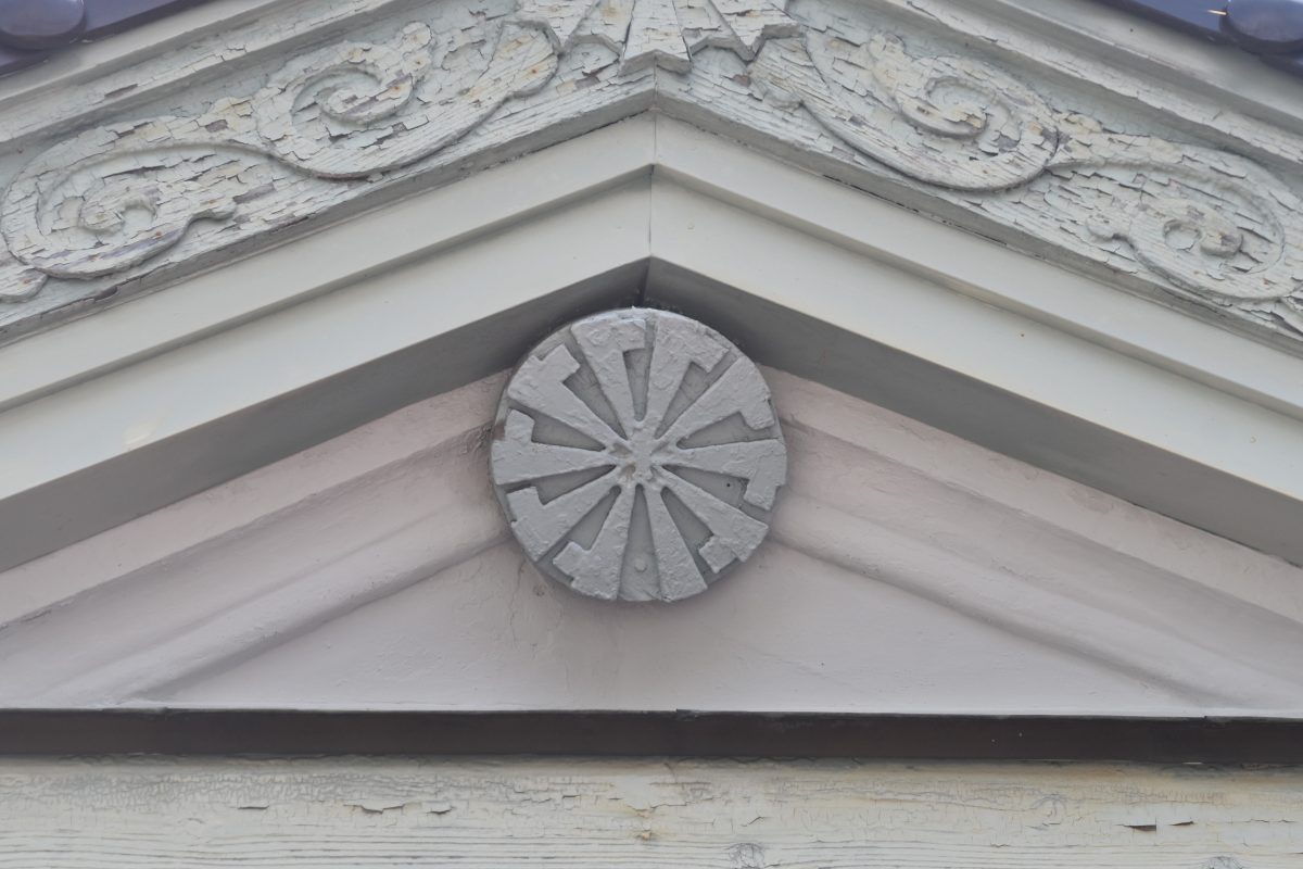ちなみに、正面の軒瓦下に残されている生野の旧町章は、カタカナのイの字9個とノの字1個を組み合わせて、生野が表現されていますので、要チェックです。