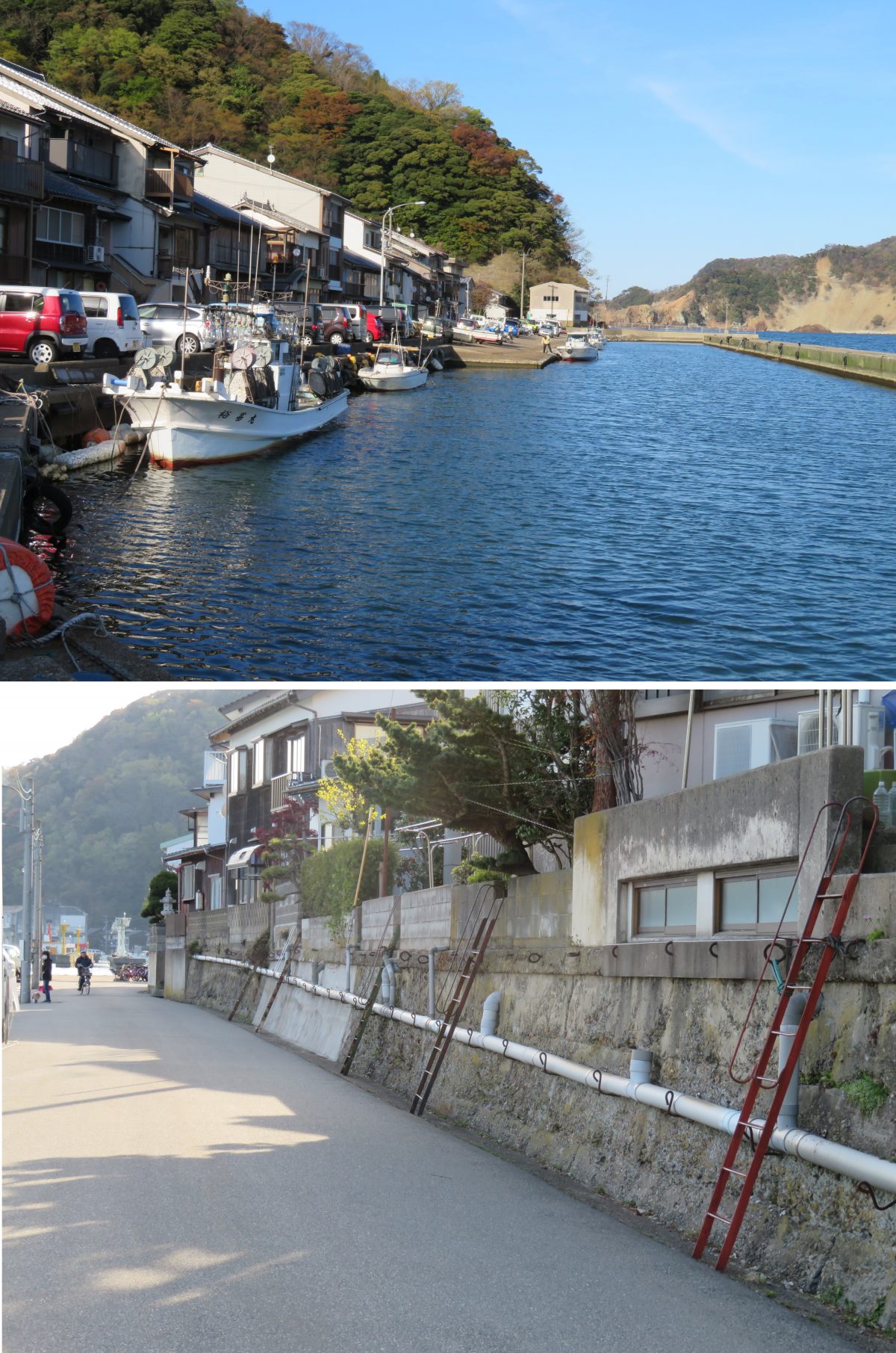 細く伸びた道には民家が並び、津居山漁港を形成しています。湾に面した民家の裏側には梯子が掛けられ、海に密接した生活が偲ばれます。