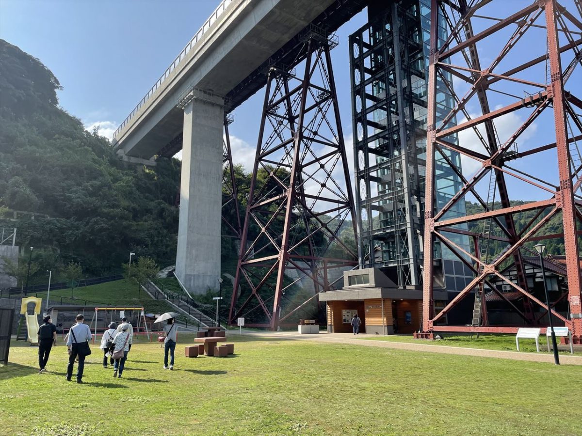 空の駅は平成25年に完成しました。橋脚の間に見えるエレベーター「余部クリスタルタワー」は平成29年に完成し、それまでの間は40m上空まで、坂道を15分ほどかけて登っていたそうです。