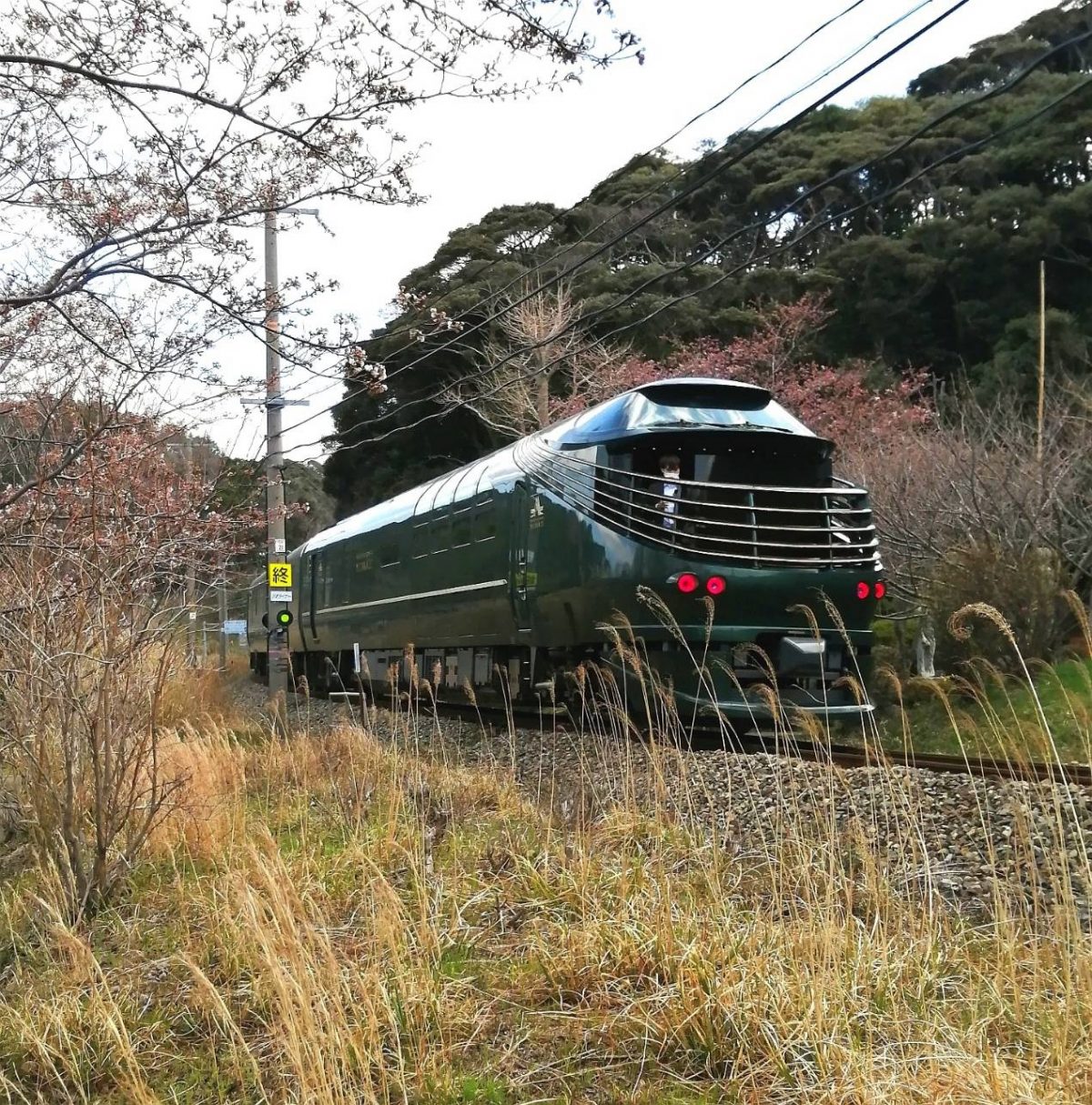 竹野町切浜近辺を走るTWILIGHT・EXPRESS 「瑞風」と桜