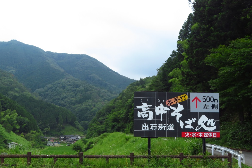 8月の「愛宕の火祭り」で有名な出石町の伊福部神社の前をほんの少し走ると道が二つに分かれます。一方は出石の奥山を通って朝来市の竹ノ内に出る道。出石街道は右側県道255線方面へ。旧道というと少し狭い地道のイメージですが、完全舗装の離合にも問題ない快適な道で峠近くには休憩場所もある。そして立派な開通記念碑。