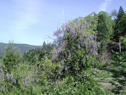 田植えも終わり谷川沿いに咲き誇る野生の藤の花(ここでも支えとなった潅木は枯れ木となっている)。