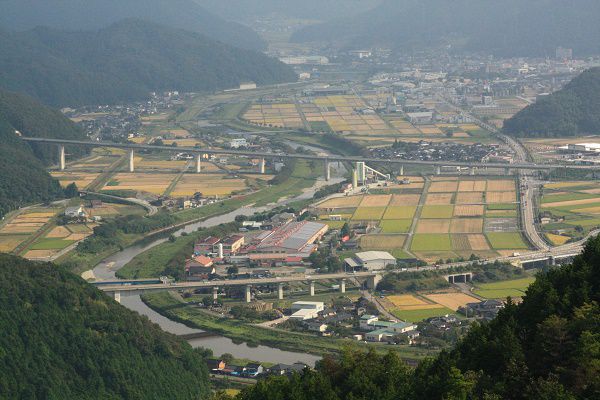 北千畳から見下ろした和田山方面、播但道と北近畿豊岡道の高架と大きく蛇行する円山川と田園風景。