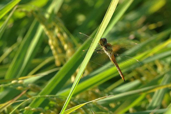 空中にいる時間がほとんどのウスバキトンボが、ようやく稲の葉に止まりました。やはり赤とんぼとは違ったシルエットですね。