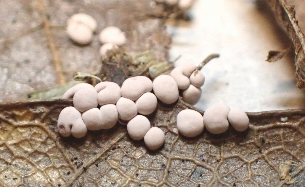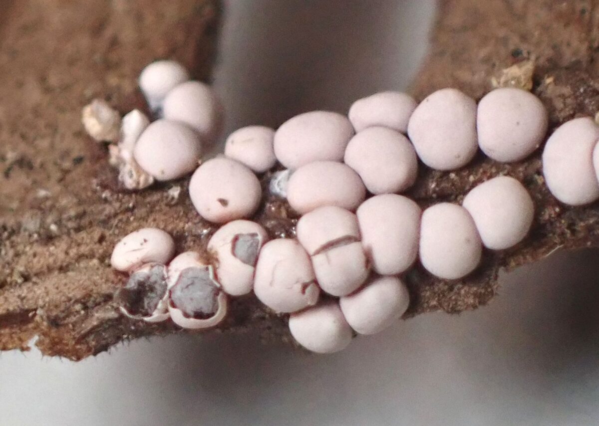 この色合い、どこかで見たような気がする、なんとなく見かけたような気がする。はッと思い出したのである。そう、マンジュウホネホコリだ。微かに、上品にうっすらと紅に染まった、半球形から少し押し下げられた球形のお饅頭。山の芋の粉を主原料とする生地で餡を包んで蒸した、上品なお饅頭。しかも紅白の紅い方。マンジュウホネホコリの和名の由来は、半球形から少し押し下げられた球形という形状、基本的な上用饅頭の形状そっくりであるとともに、淡桃色であることにより慶事に用いる紅白饅頭をも表しているわけである。