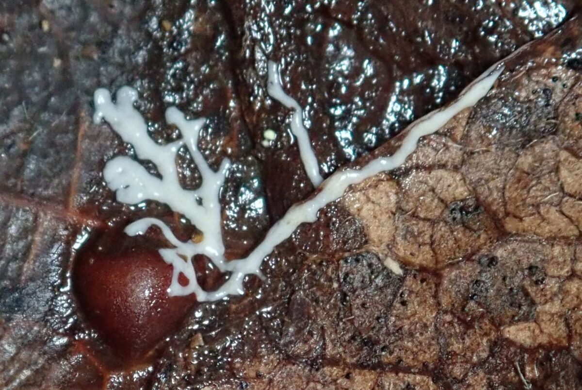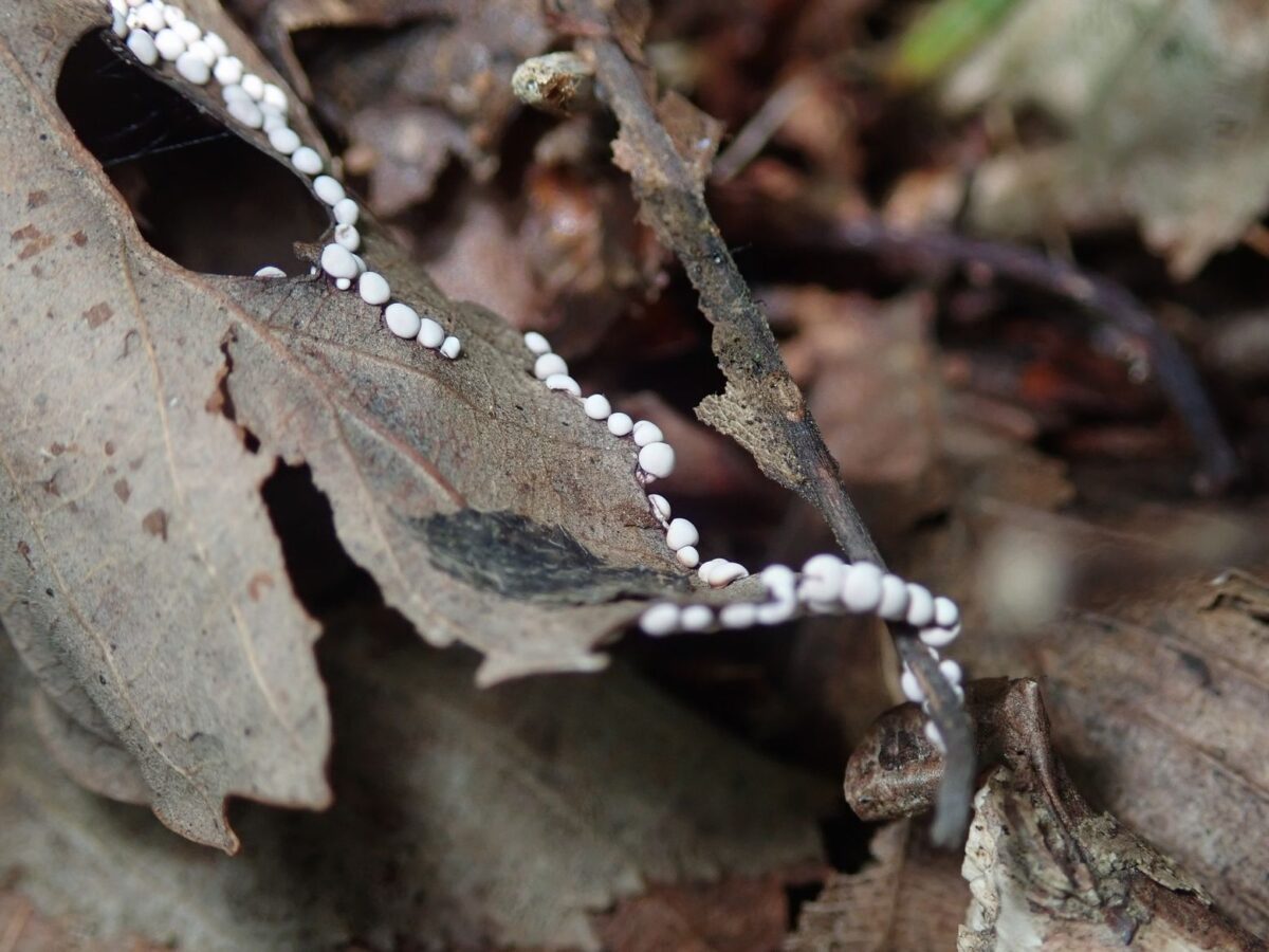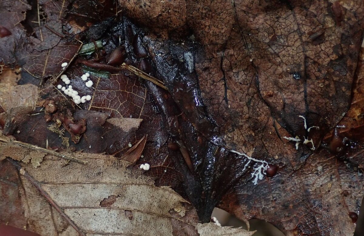 ホネホコリ属の一種を報告する。変形菌という生き物は変形菌綱に分類されている。乱暴な説明をする。変形菌綱の中でも、軸があって子嚢壁に石灰を含んでいるが、細毛体には石灰を含んでいない仲間は、モジホコリ目のカタホコリ科に分類されている。さらにカタホコリ科の中でも、子嚢壁の石灰が星形結晶のものはカタホコリ属に、粒状のものはホネホコリ属に分類されている。