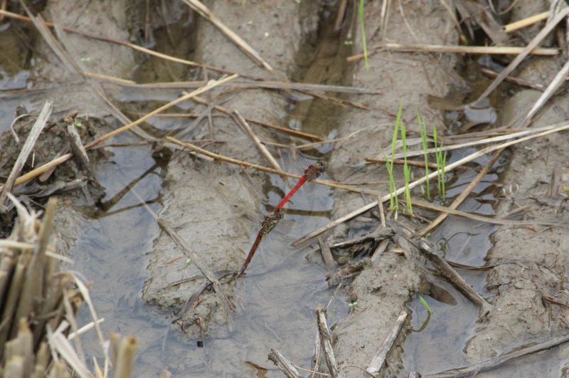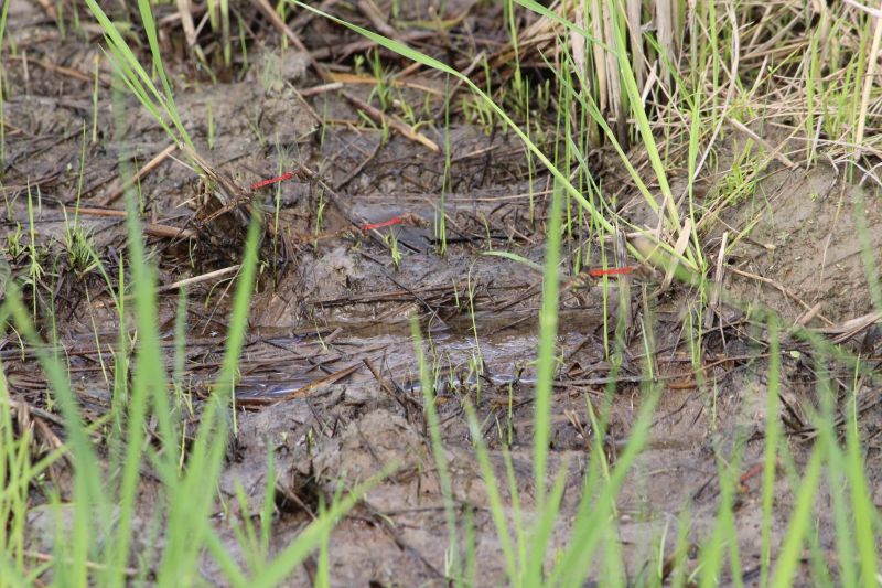 最近の田んぼは水はけが良くなり、アキアカネが産卵できる場所は限られています。田んぼの隅にできた小さな水たまりにたくさんのアキアカネが集まっています。