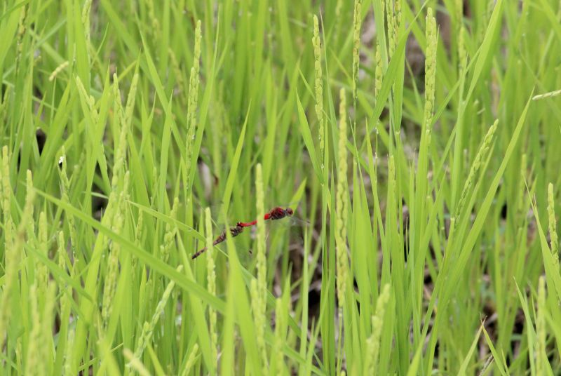 ナツアカネも田んぼに産卵しますが、水がない二藩穂の出た水田で卵をばら撒くように産卵します。また、雄は秋になると腹部だけでなく、胸から顔まで真っ赤になります。