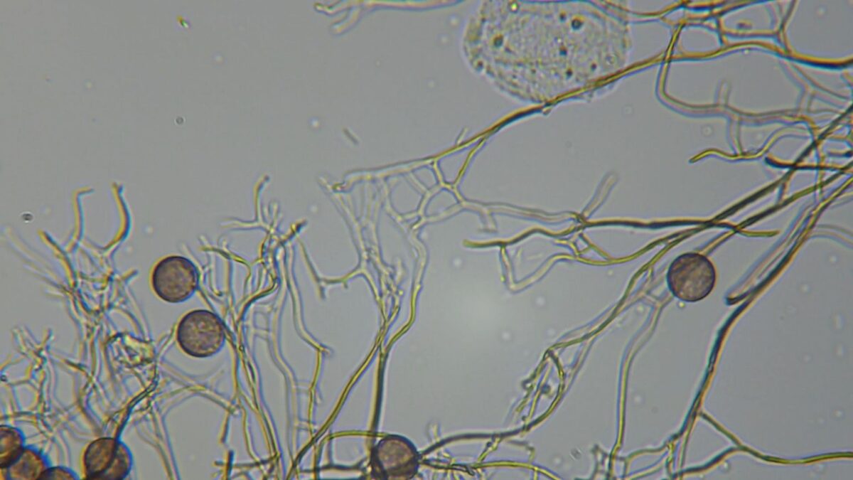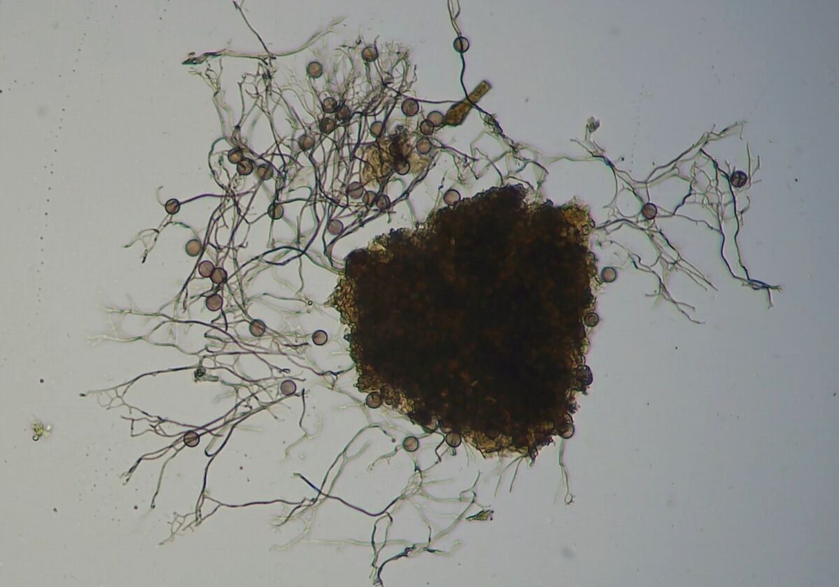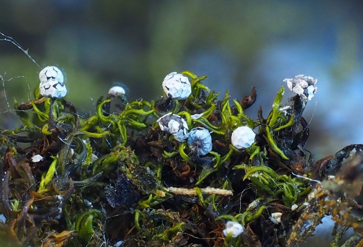 子嚢: 白色~灰色で亜球形、直径0.4~0.5㎜。隆起した多角形の裂開線がある。