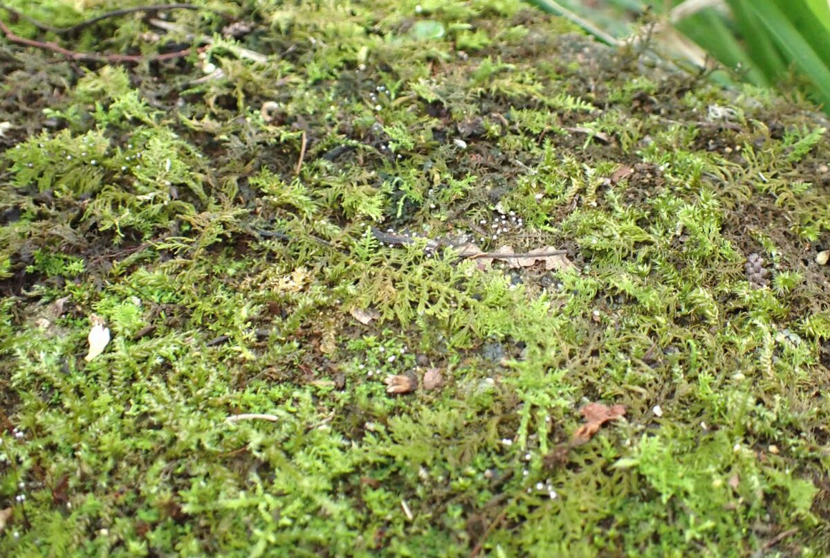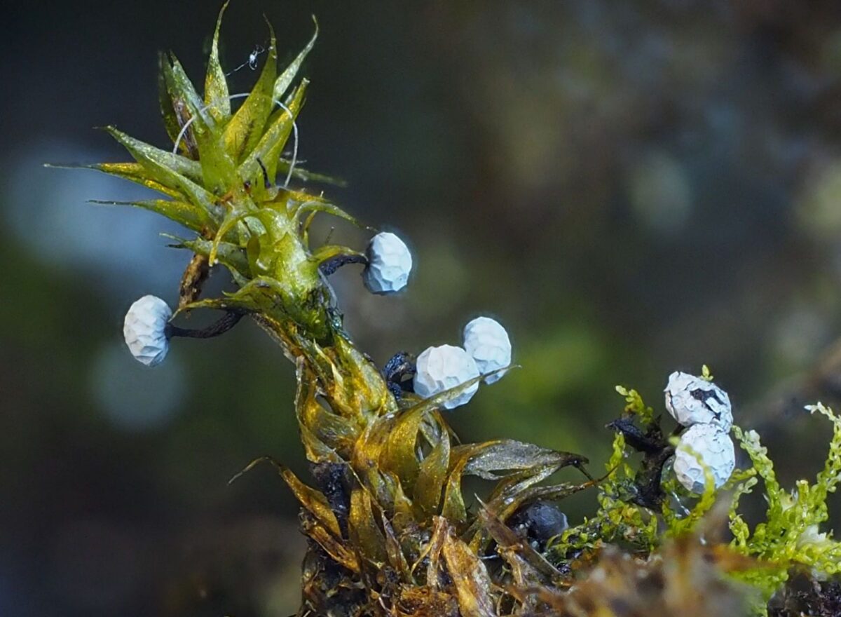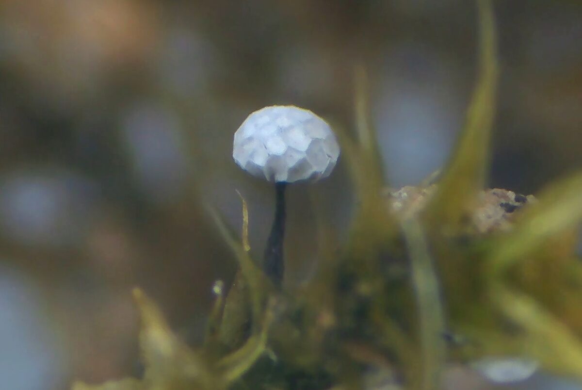 高さ1㎜程度の子実体がコケの間に紛れているため、大量発生している場合は別として、何十メートルも続くコンクリート縁石のコケの中から数粒~数十粒の彼らを見つけ出すのは至難の業である。いや、むしろ元々存在しておらず、見つかるはずのない作業である可能性も高い。