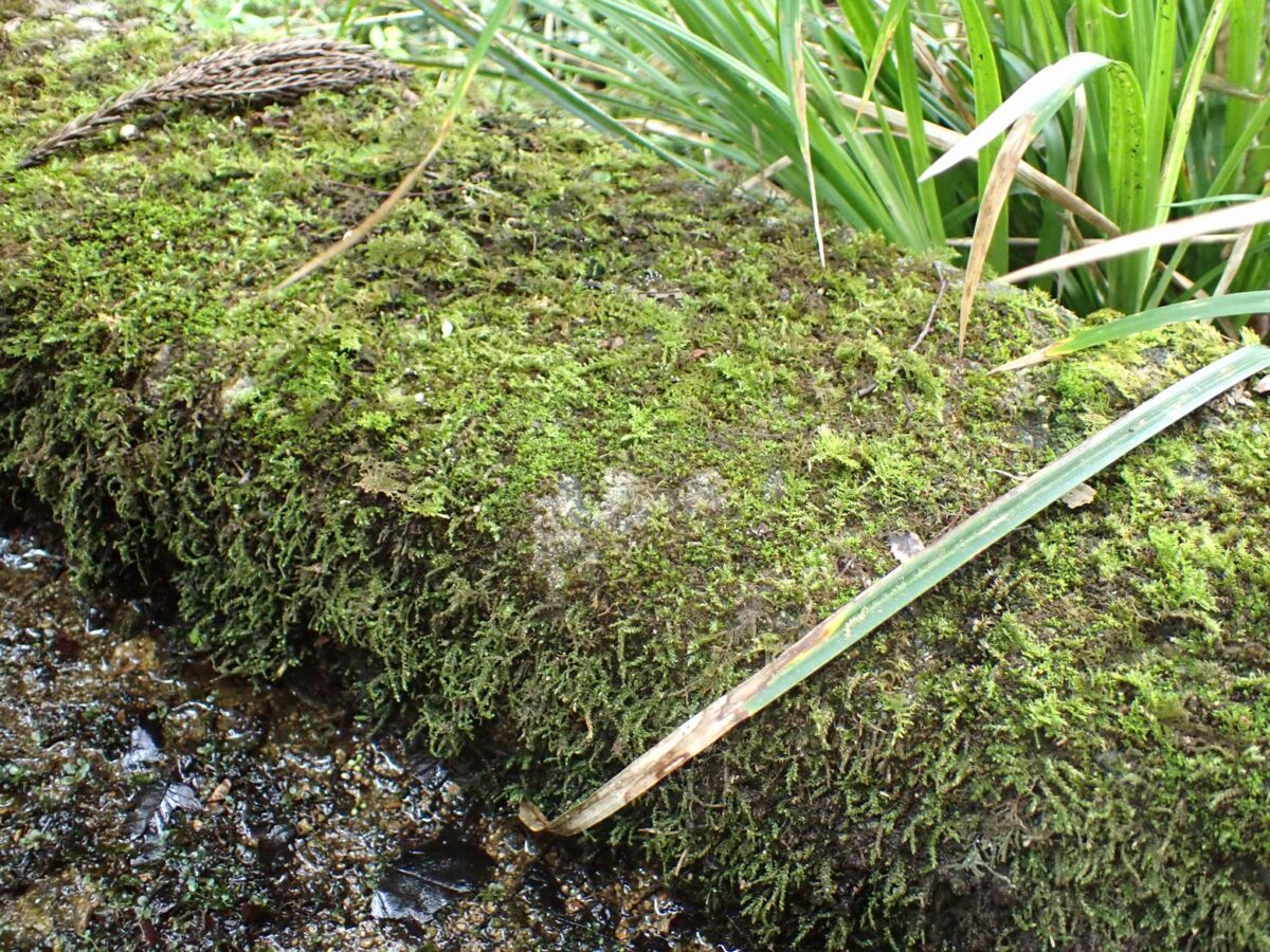 山間道のコンクリート擁壁や縁石などの湿潤なコンクリート部分に生えるコケはよく見られるが、このような環境は石灰成分が豊富で、ある種の変形菌が好むということをFacebookのグループで教わっていた。