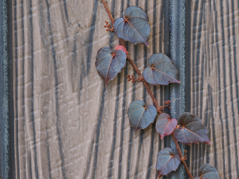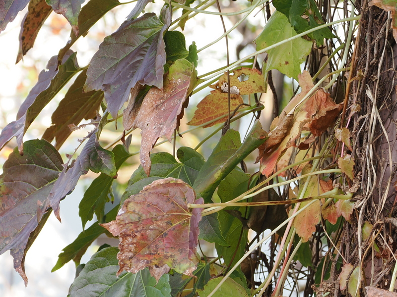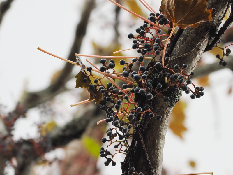 さすがブドウ科です。おいしそうな果実です。しかし、人間には全くおいしくない果実です。鳥たちにはきっとおいしいのでしょう。ツタはいたるところに生えています。鳥たちが食べて種を運んでいるのだと思います。