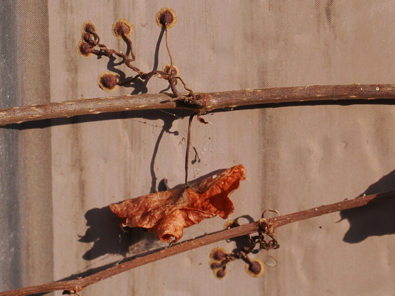 ブドウ科の他のつる植物は、先のとがった巻きひげを伸ばして木などに絡みつくようにして広がって行くのですが、ツタは巻きひげの先が吸盤のような形になっています。しかし、これは吸盤ではなく接着盤のような働きをしているようです。この接着盤からは粘着性の物質も出ており、さらにひげのような細い根も出て、絡むことなく建物の壁など垂直な面にも広がることができます。ツタという名前は、”つたって”這い上がっていく様からついたという説もあります。納得の名前です。