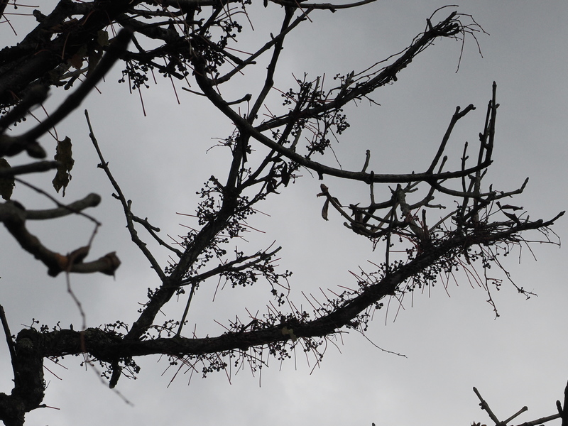 冬に近づくと落葉しますが、葉柄を残して葉身が先に落ちます。葉柄もやがて落ちるので下には葉身と葉柄がバラバラになって落ちています。