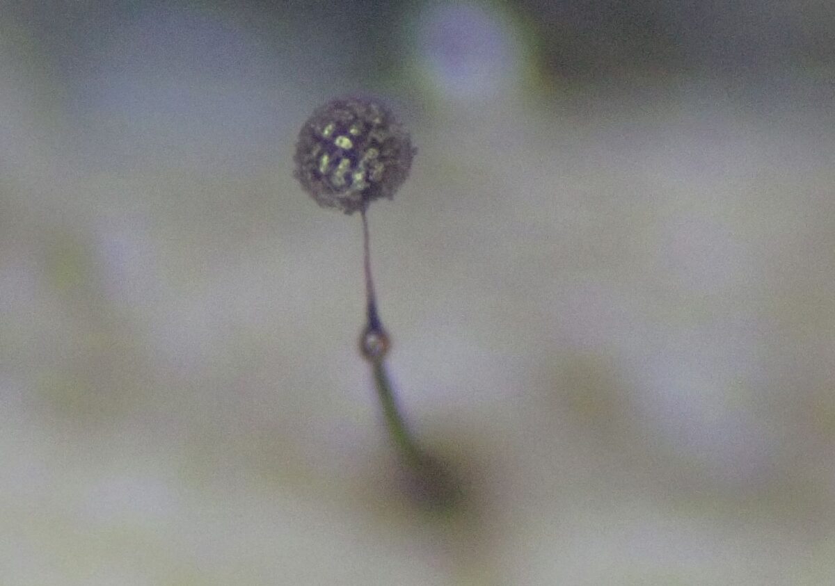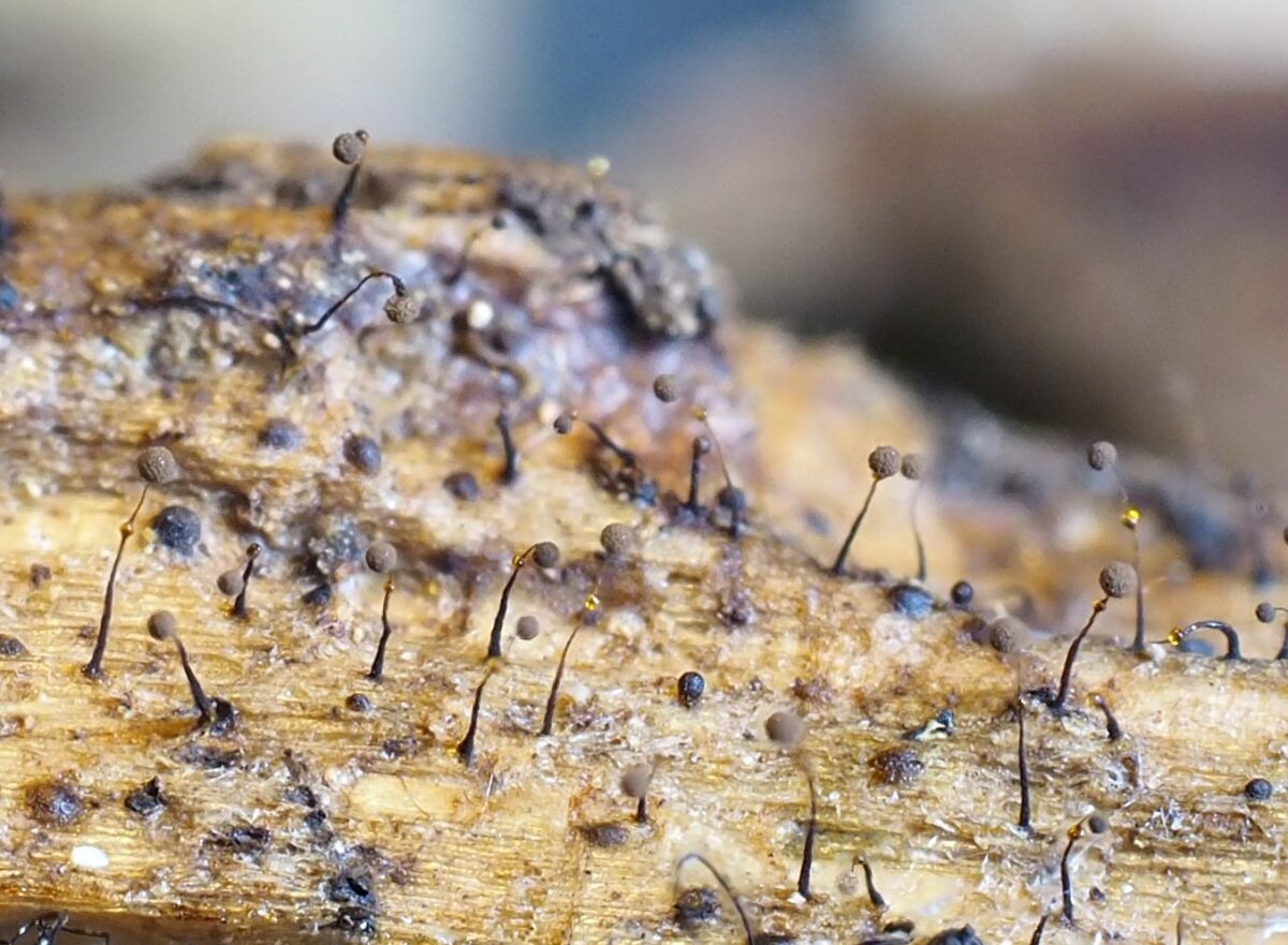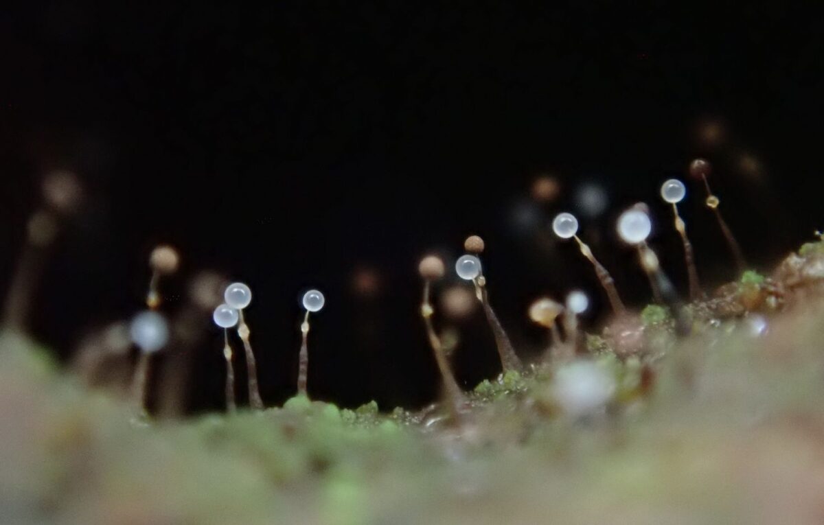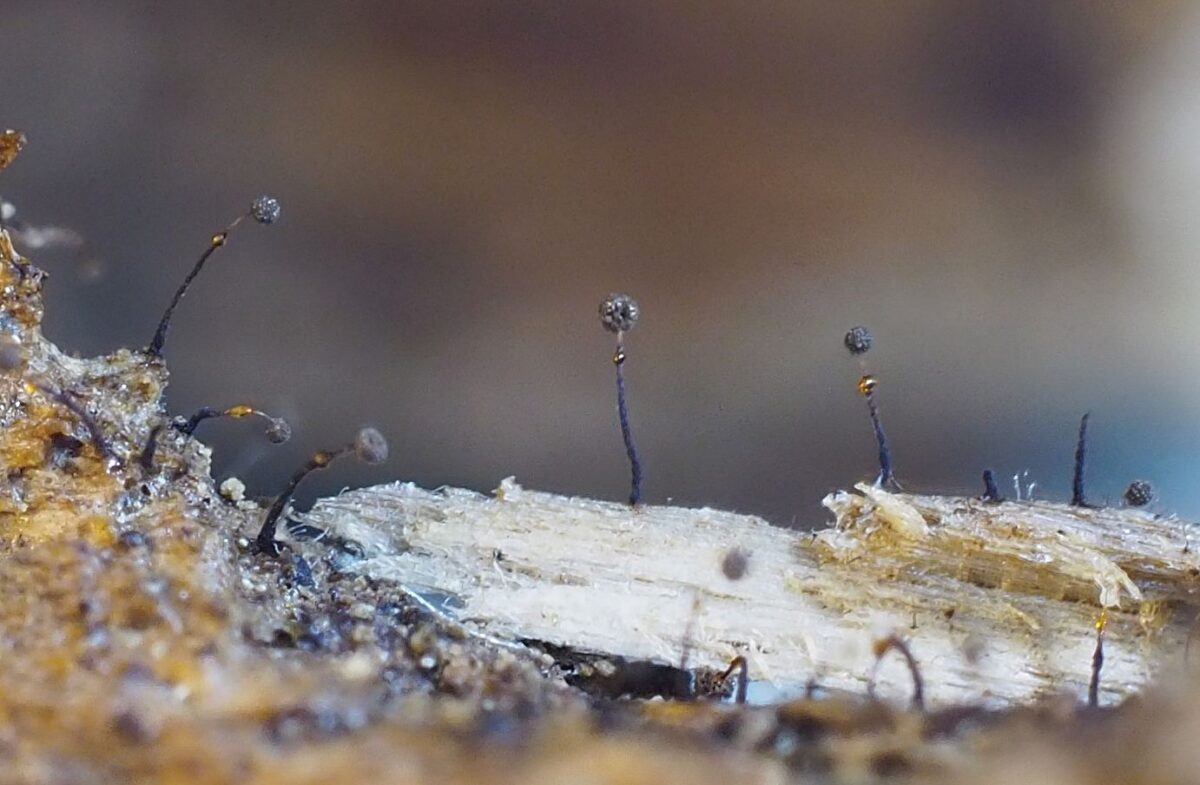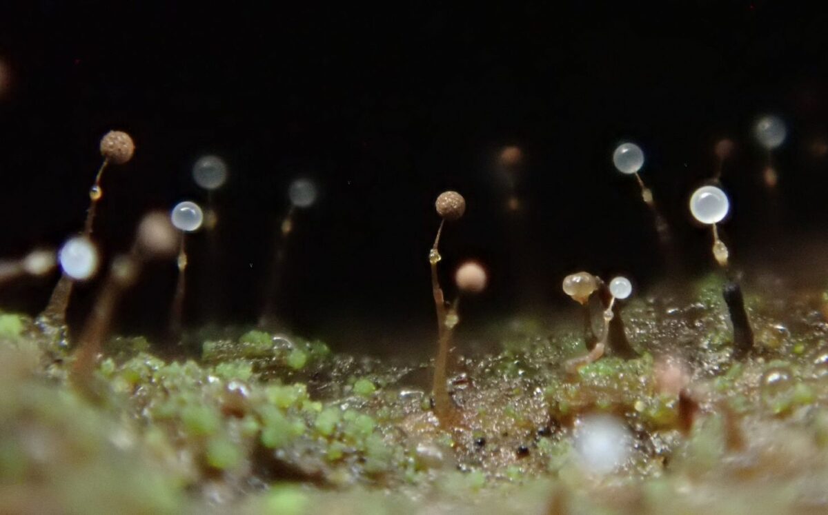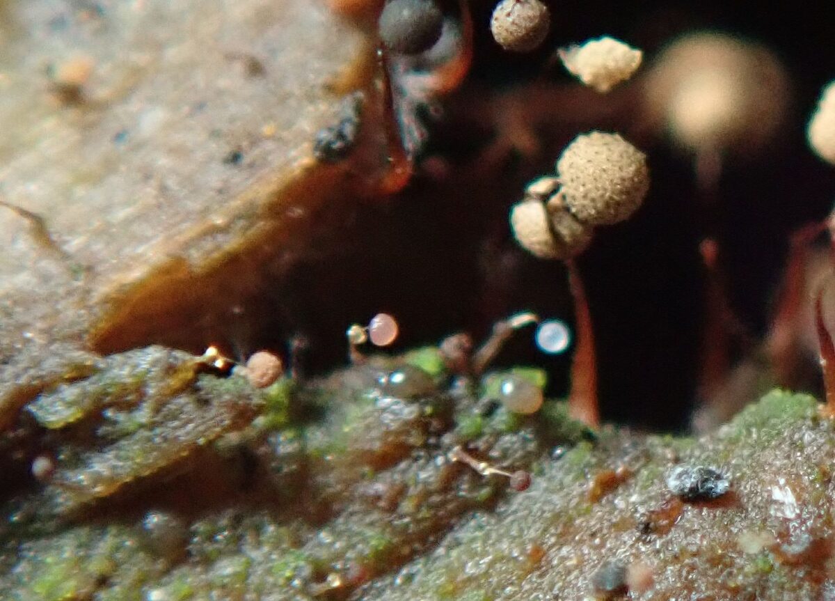 写真上:サラナシアミホコリとアミクビナガホコリの混在する様子。高さ3㎜程度のサラナシアミホコリが巨大に見える。