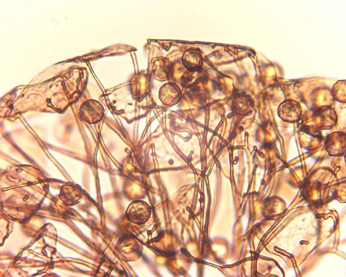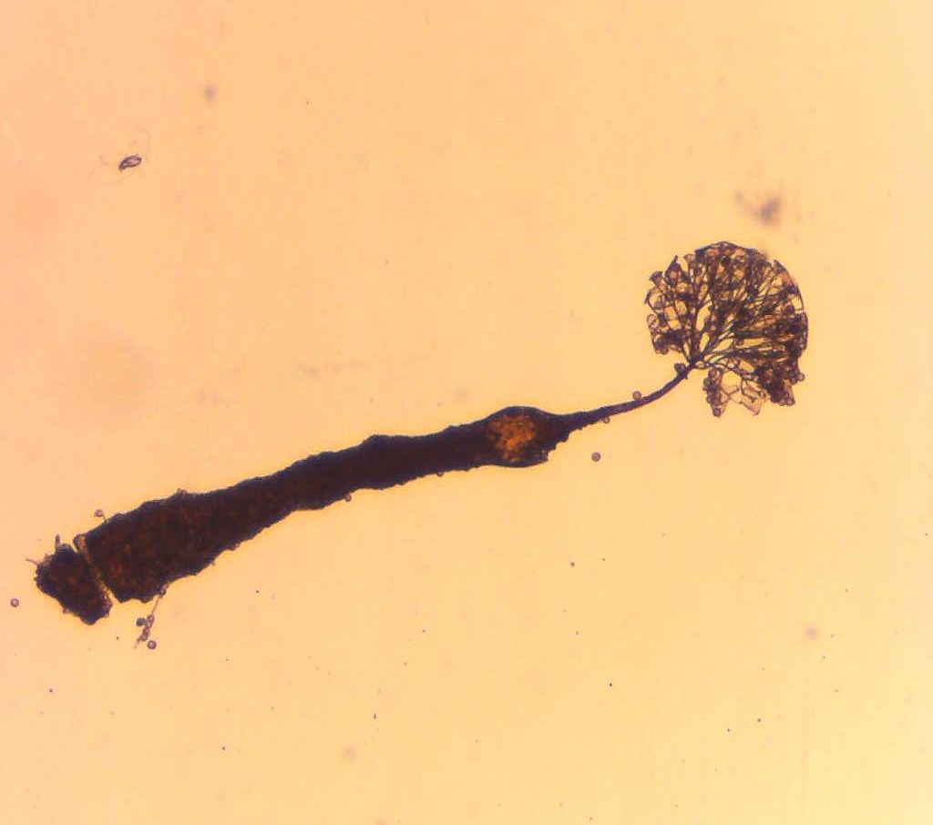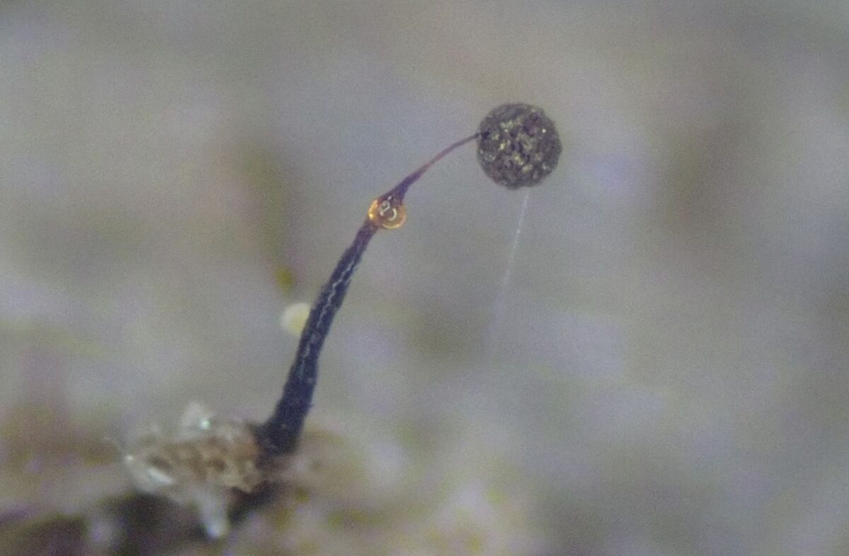 子実体は単子嚢体型、群生。有柄で高さ1~1.5㎜。子嚢は褐色、球形で直径0.1~0.2㎜。子嚢壁は早落性だが、一部は細毛体の先端に付着した壁小板として残存する。壁小板に網状紋がある。柄は長く、下半部に残留物を含み、上部は半透明で褐色。ふつう途中に光沢のある球状の膨らみがある。軸柱はないか短い。細毛体は褐色、軸柱または子嚢底から出て分岐し、時には連絡する。胞子は細かい疣型、ときに角張り、直径8~10µm程度。春から秋に腐木上に稀に発生、主に湿室培養で得られる。