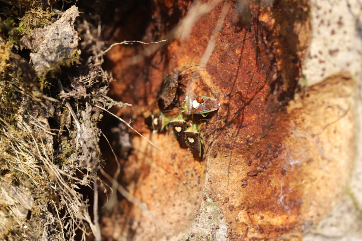 苔の付いた樹皮をはがしてみると、中に複数のカメムシが越冬していました。写真の上部の黄色い紋がない茶色のカメムシはクサギカメムシです。家の中に入り込み越冬するのでよく知られています。自然の中では木の隙間のような場所で越冬するようですね。 (写真・文 上田尚志)