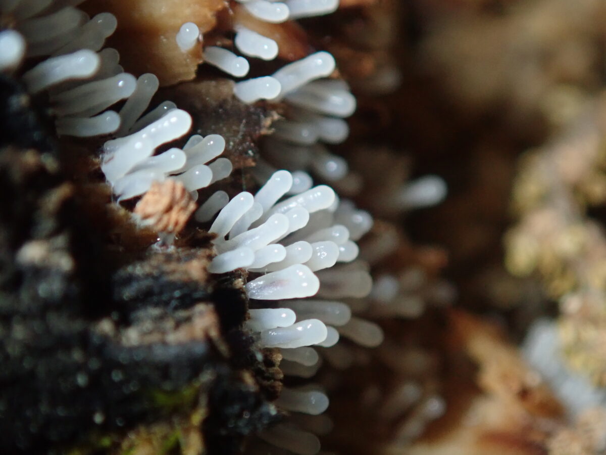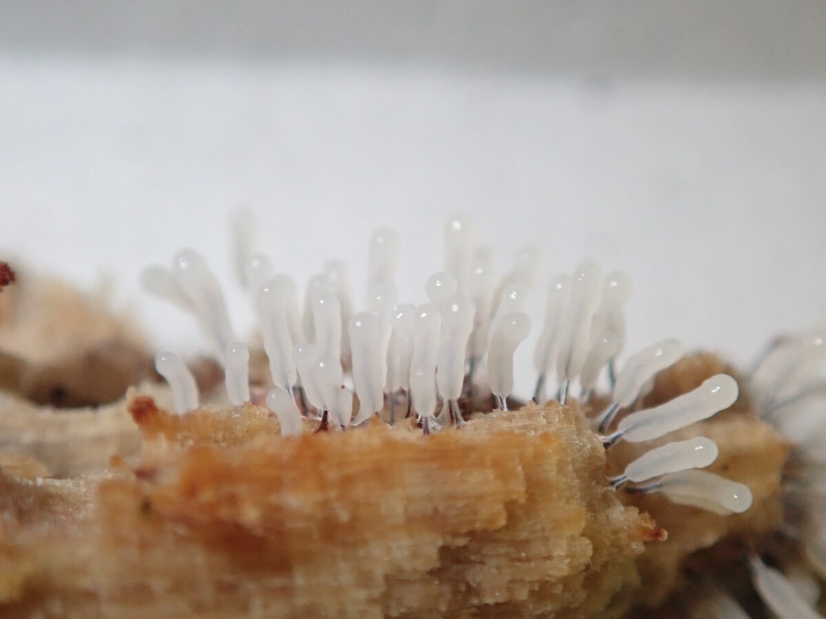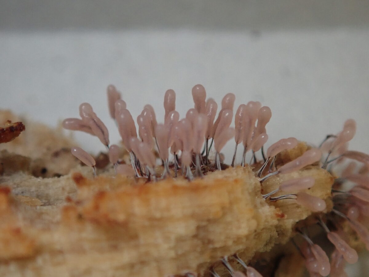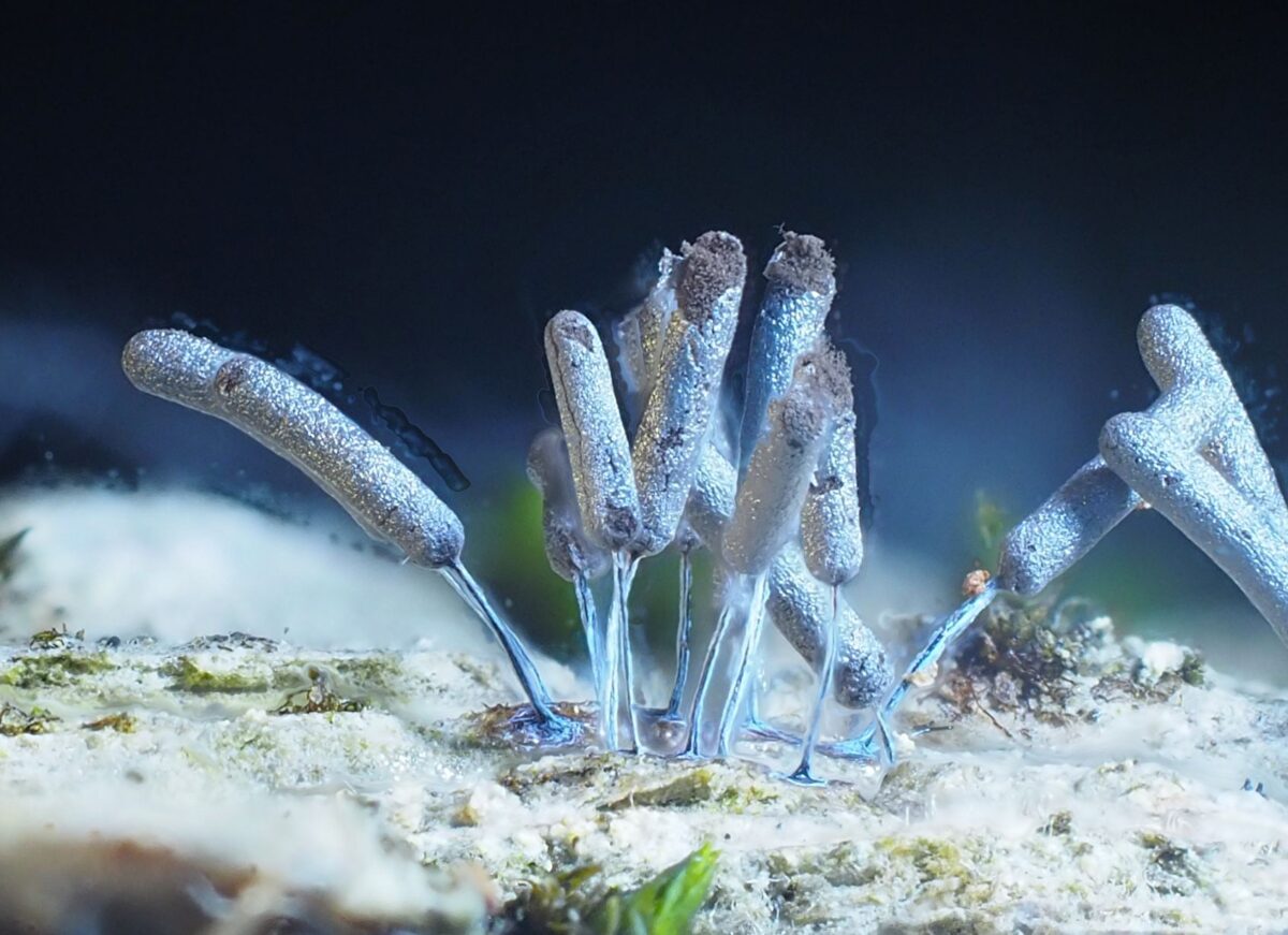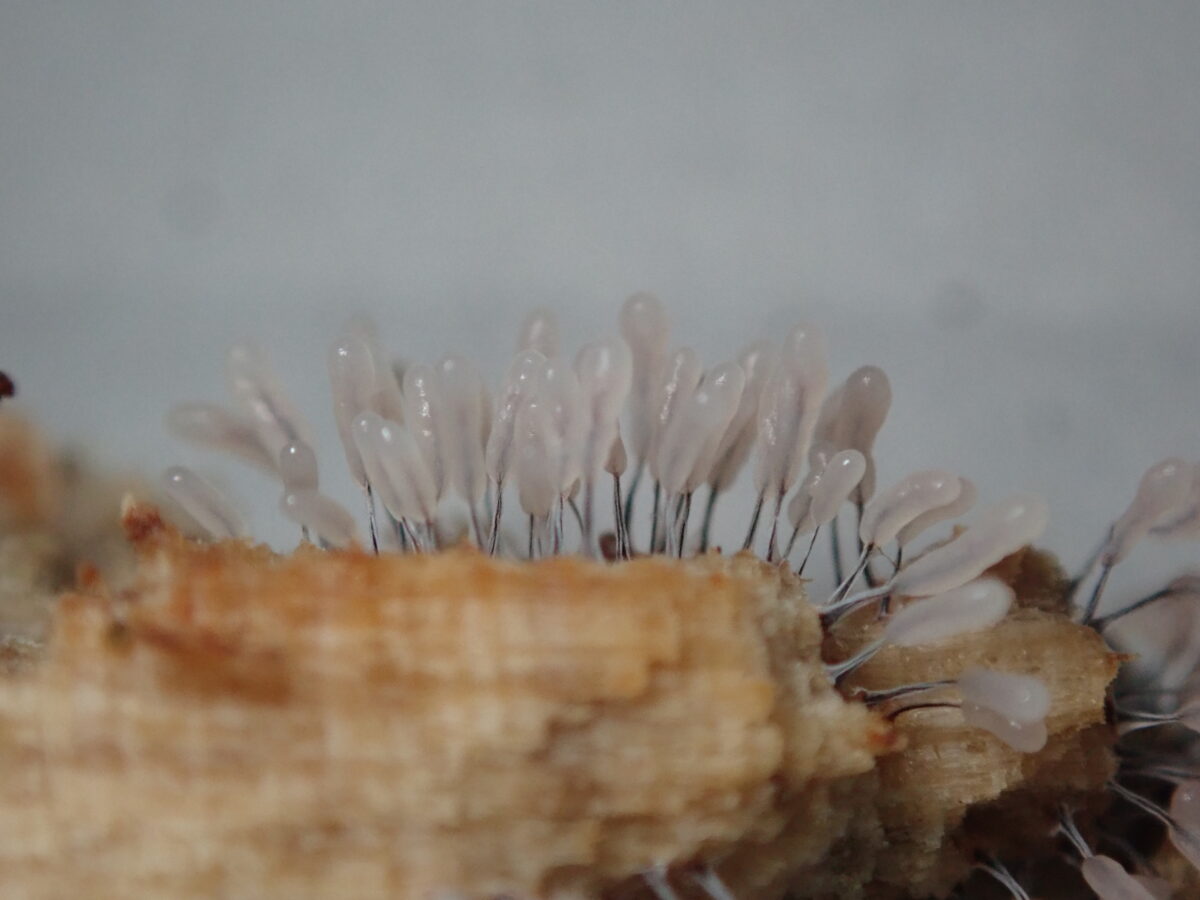 最後に、2021年5月10日の午前中に変形体から子実体へ変身中のものを採取したので、自宅へ持ち帰り観察した記録写真を掲載しておく。真っ白な子嚢が立ち上がり午後に入り徐々に褐色に色づいてゆき、深夜から翌朝に完成していくのが分かる。写真(上)は5月10日9:40、現地にて。