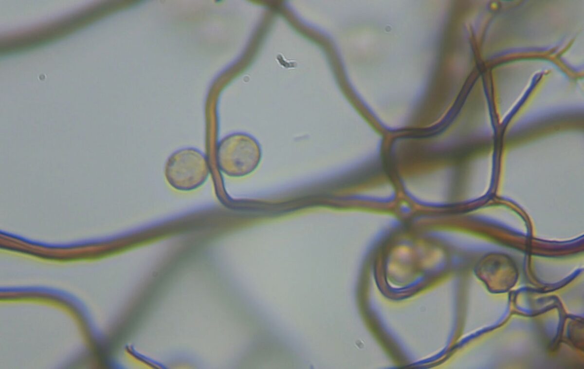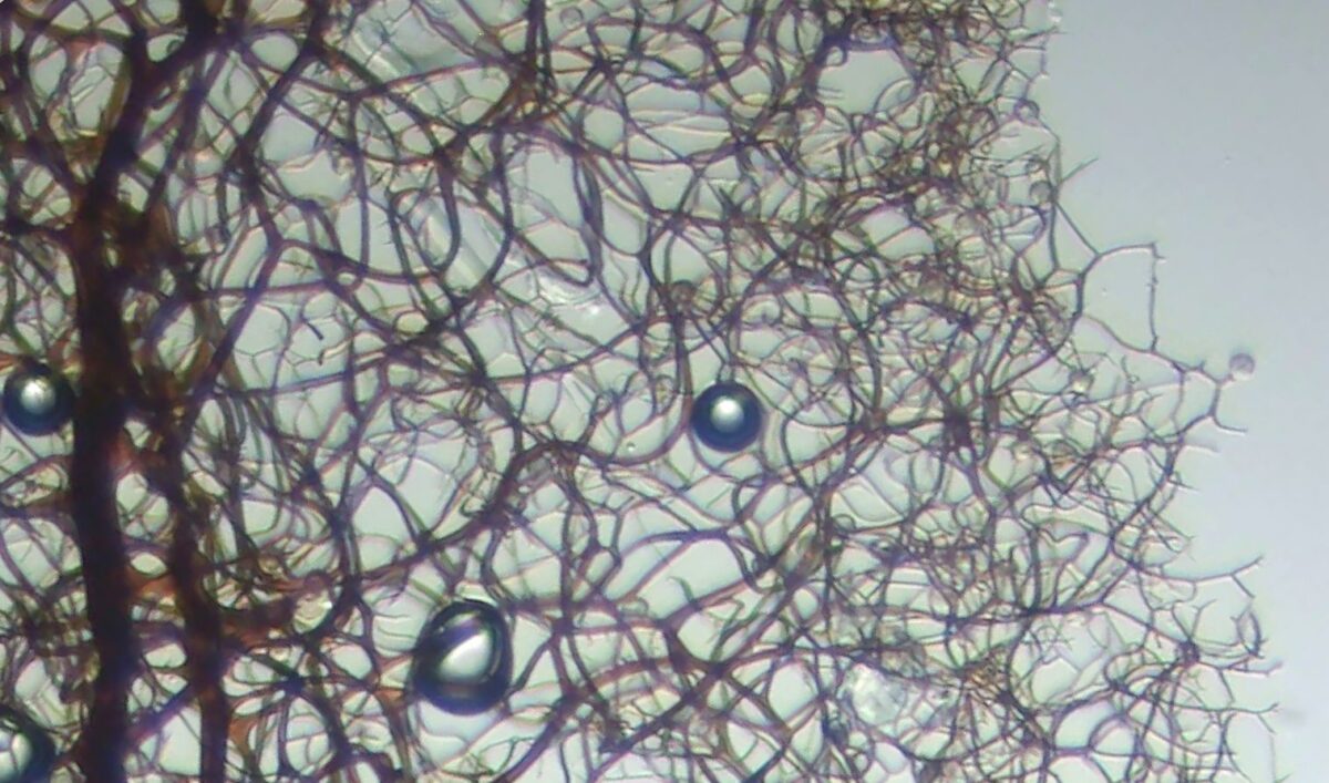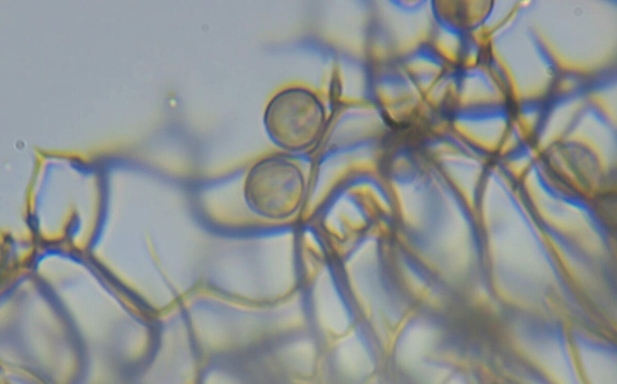 ダテコムラサキホコリは銀色~灰色の被膜が特徴的であるので、ほとんどの場合、ルーペや実体顕微鏡により同定できると思う。