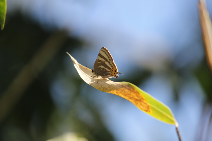 4月のはじめ頃、ミツバツツジやスミレ類が咲く明るい里山でよく出会うのがトラフシジミです。同時に見られるルリシジミやコツバメより少し大きく、後ろ翅の裏面にあるオレンジの模様が特徴です。白い縞模様は虎斑模様。翅の表側は濃い青色です。