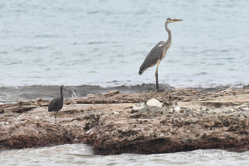たまたまアオサギと並んだ写真が撮れました。クロサギの大きさがイメージできるでしょう。私の普段の海鳥の観察地は豊岡市の東隣りの久美浜町の海岸です。今回の写真もそこで出会ったクロサギです。但馬海岸でも生息しており、珍しい鳥というほどのことではないですが、数は多くはありません。見つけるとついレンズを向けてしまうほどの、出会うと嬉しい鳥の一種です。