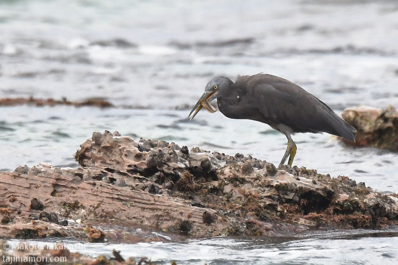 海水浴や海遊びの人たちで賑わう海では、ひと目のつかない海岸でひっそりと暮らしている色の黒いサギ。夏が去り人の去った海岸で姿をときどき見かけるようになります。見た目どおり、クロサギという名前のサギ科の鳥です。シラサギの中で一番小型のコサギくらいの大きさをしています。岩礁のタイドプールで魚を捕まえて食べます。