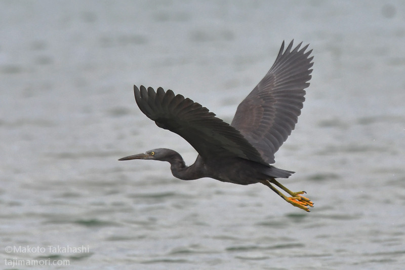 クロサギの飛翔姿です。足が黄色いところもコサギに似ていますが、コサギは足指だけが黄色いのに対し、クロサギは脚全体に黄色いです。
