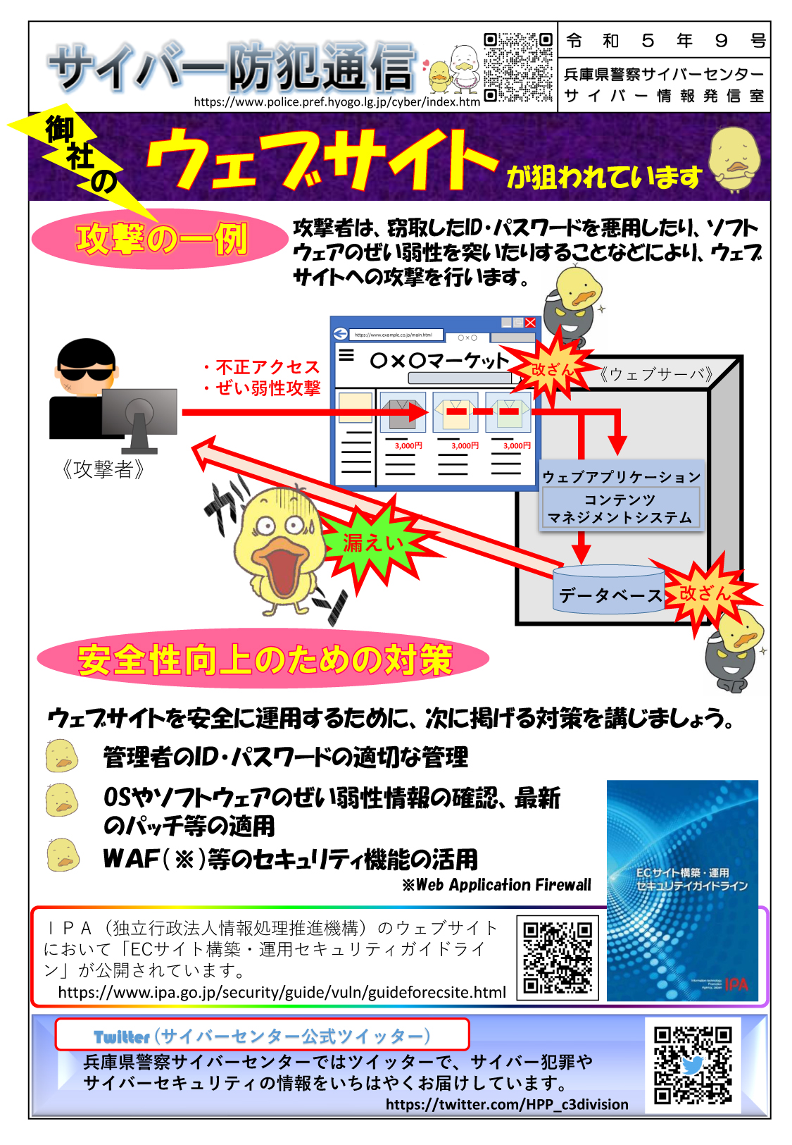 サイバー防犯通信 令和5年9号「御社のウェブサイトが狙われています」 投稿日 : 2023.06.16 | 但馬全域| サイバー防犯ボランティア 御社のウェブサイトが狙われています でシェア でシェア でシェア でシェア 御社のウェブサイトが狙われています 【PDFのダウンロードはこちら】 「兵庫県警察サイバー情報発信室」ホームページ ⇒http://www.police.pref.hyogo.lg.jp/cyber/ 情報提供元 兵庫県警察サイバーセキュリティ・捜査高度化センター サイバー企画課 サイバー情報発信室 リンク先 兵庫県警察サイバーセキュリティ・捜査高度化センター サイバー企画課 サイバー情報発信室 連絡先 兵庫県警察サイバーセキュリティ・捜査高度化センター サイバー企画課 サイバー情報発信室
