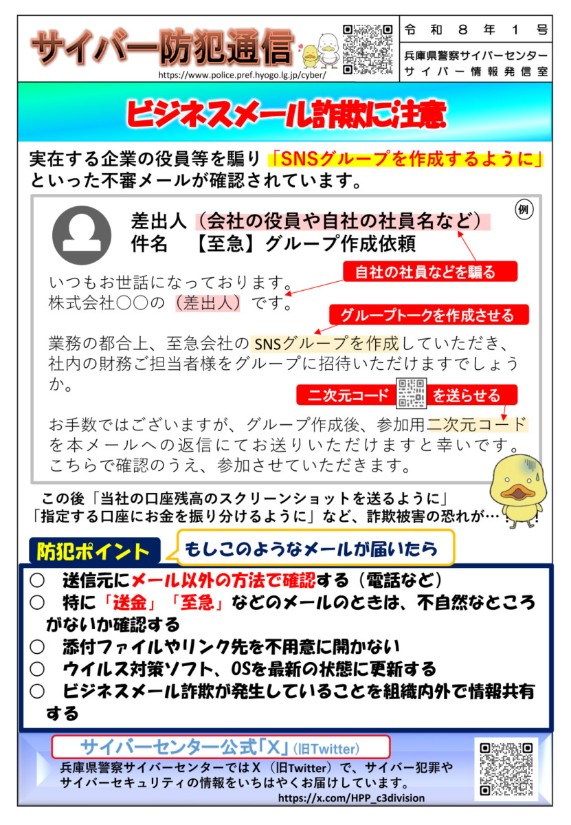 サイバー防犯通信 令和8年1号 「ビジネスメール詐欺に注意」 投稿日 : 2026.01.31 | 但馬全域| サイバー防犯ボランティア 「ビジネスメール詐欺に注意」 でシェア でシェア でシェア でシェア 「ビジネスメール詐欺に注意」 【PDFのダウンロードはこちら】 「兵庫県警察サイバー情報発信室」ホームページ ⇒http://www.police.pref.hyogo.lg.jp/cyber/ 情報提供元 兵庫県警察サイバーセキュリティ・捜査高度化センター サイバー企画課 サイバー情報発信室 リンク先 兵庫県警察サイバーセキュリティ・捜査高度化センター サイバー企画課 サイバー情報発信室 連絡先 兵庫県警察サイバーセキュリティ・捜査高度化センター サイバー企画課 サイバー情報発信室