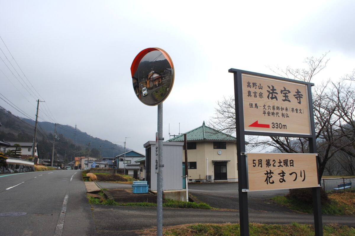 岡田公民館の手前に看板出てました。法宝寺に行きます。
