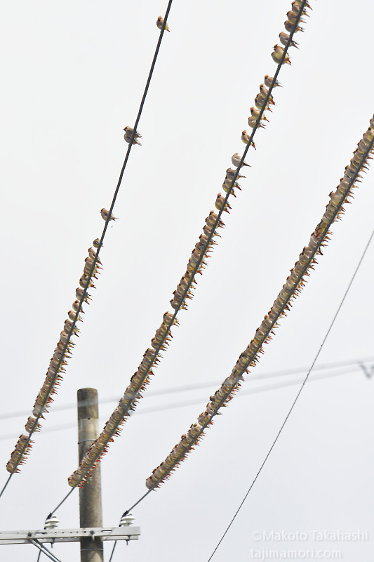 2026年3月初旬、市内のあちらこちらでヒレンジャクとキレンジャクの大きな混群が観察されました。レンジャクは漢字で連雀と書きます。その名のとおり、群れが一列に連なって電線などにとまっているのを見かけます。ヒレンジャクとキレンジャクの識別は容易で、尾羽の先端が赤いのがヒレンジャク、黄色いのがキレンジャクです。
