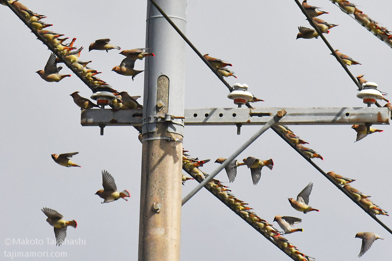 電線に連なって休んでいたレンジャクは、一定の時間が経過すると一斉に飛び立ち、電線の下にある民家の庭のクロガネモチの赤い実に群がります。レンジャクが飛ぶ際、ジェット機のような「ヒューン・ヒューン」という特徴的な声を出します。日本には冬鳥として飛来するレンジャクは、冬の間は平地で見かけることがほとんどありません。彼らの好物の代表的な植物にヤドリギがあります。厳冬期は、きっと深い山の中でヤドリギの実に頼って暮らしているのでしょう。